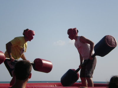 The Friday after they arrived, they went to the Hickam Beach in the afternoon while I was at work. The Top 3 club was hosting a party at the Beach so we decided to go to it. Part of the entertainment was a jousting stage. Joel, Avery and I signed up. I got beat in the 1st round by Avery then they needed another competitor so they let me joust against Joel. I won that one and had to take on Avery. By this time I was starting to figure the trick was to push instead of hit. I was able to beat Avery the second time but he landed one hit squarely on my shoulder which I injured in may. I was able to continue to joust and won an ipod shuffle. Marci and Chris both won $25.00 gift certificates and we all ate for free. I guess I got my $10.00 annual dues worth.